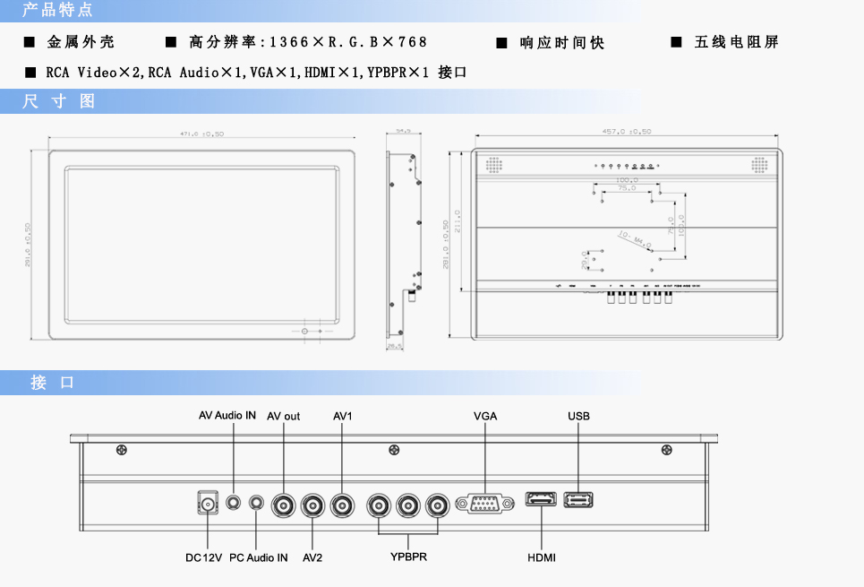 | 輸入信號(hào) | RCA Video×2,RCA Audio×1,VGA×1,HDMI×1,YPBPR×1 | ||