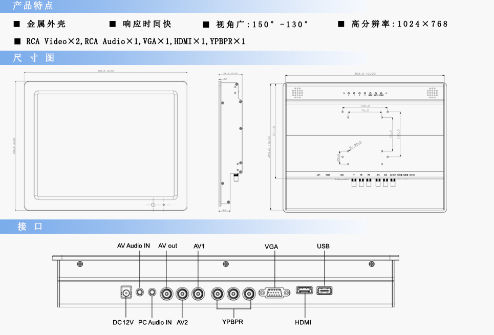 | 輸入信號 | RCA Video×2,RCA Audio×1,VGA×1,HDMI×1,YPBPR×1 | ||
