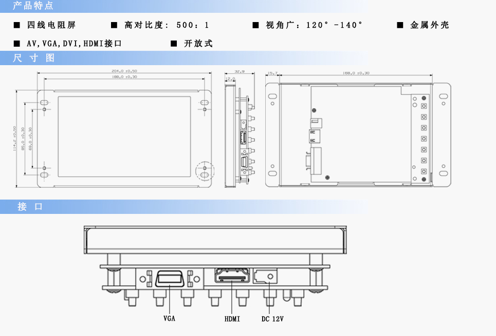 | 輸入信號(hào) | RCA Video×2,RCA Audio×1,VGA×1,DVI×1,HDMI×1 | ||