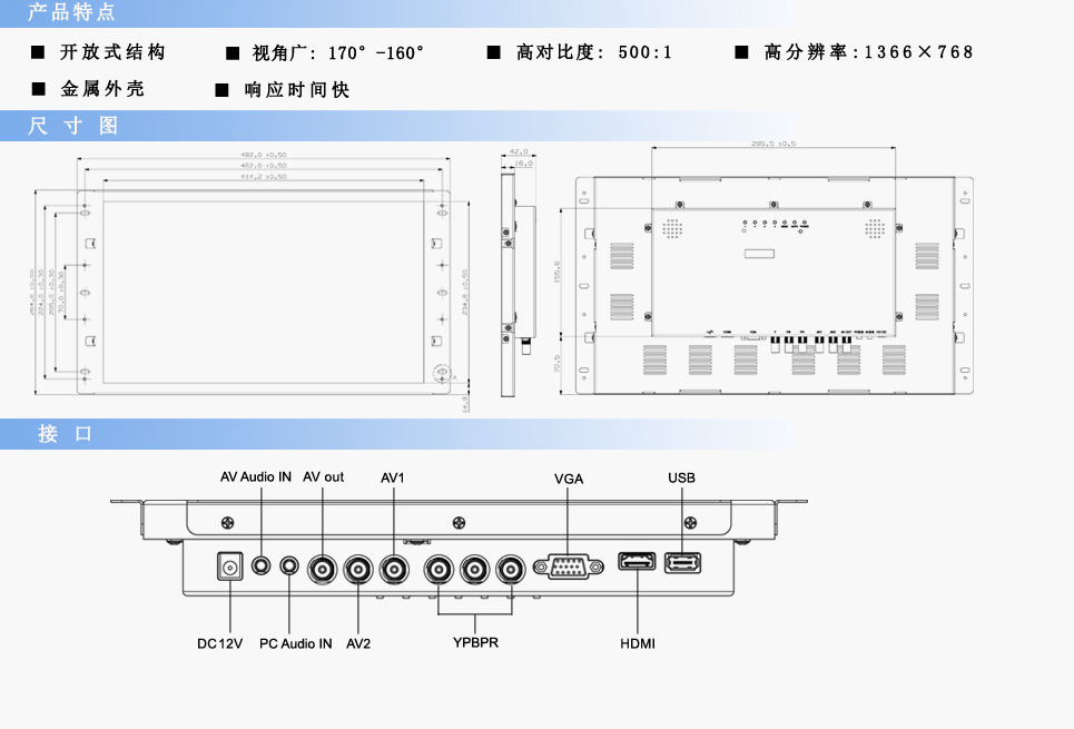 輸入信號:RCA Video×2,RCA Audio×1,VGA×1,HDMI×1,YPBPR×1